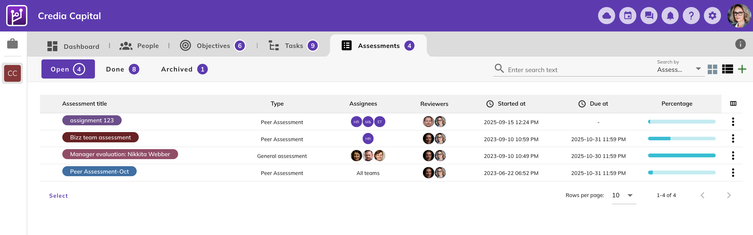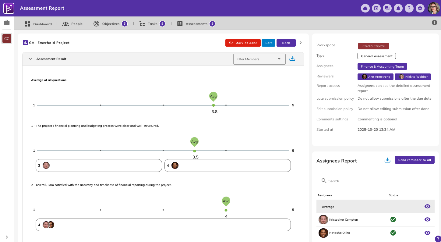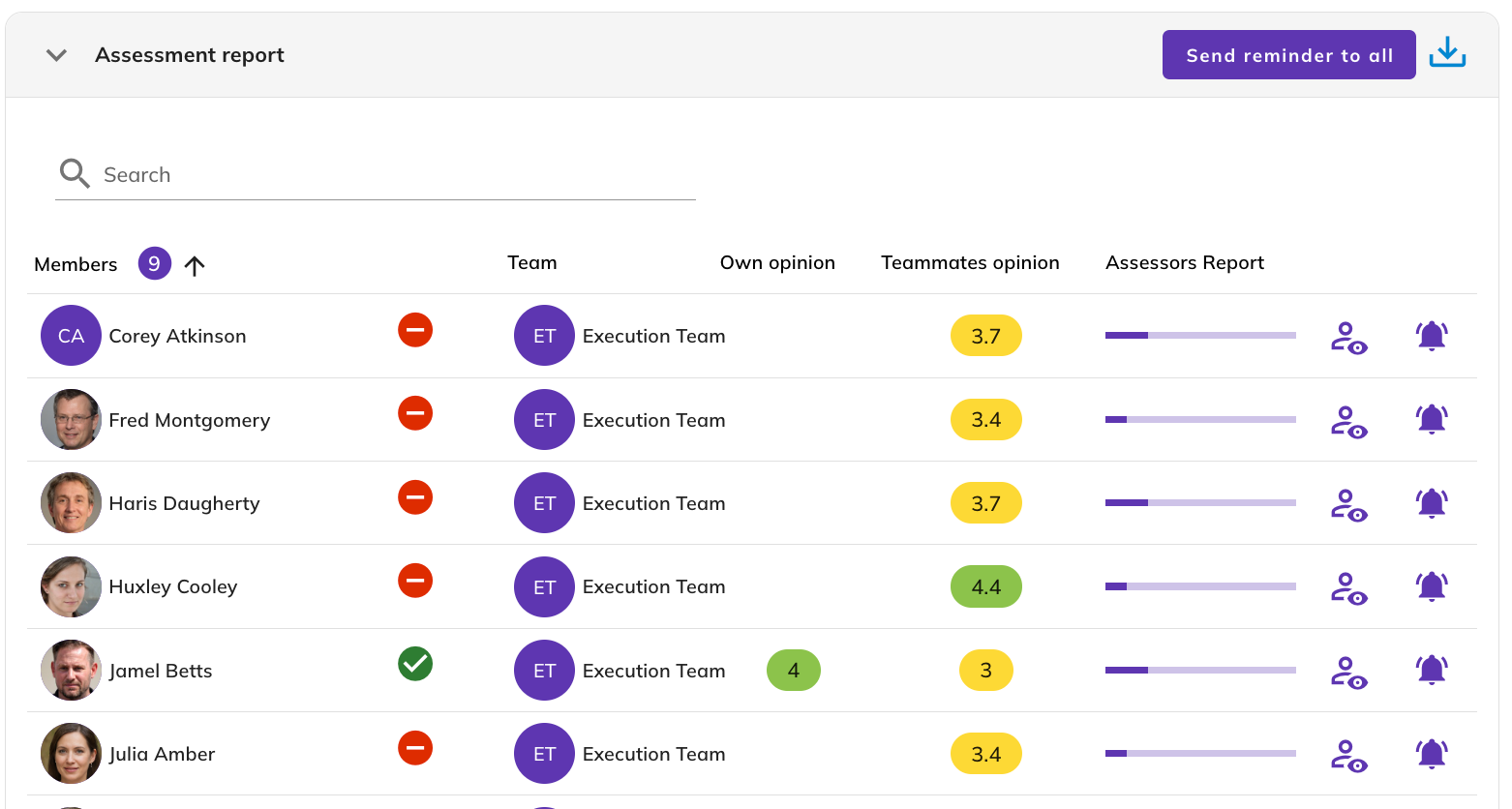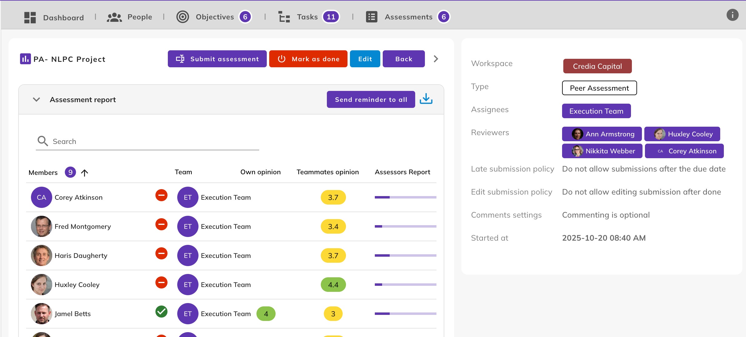 - Assessors Progress: A progress bar showing how far teammates’ evaluations have been completed.