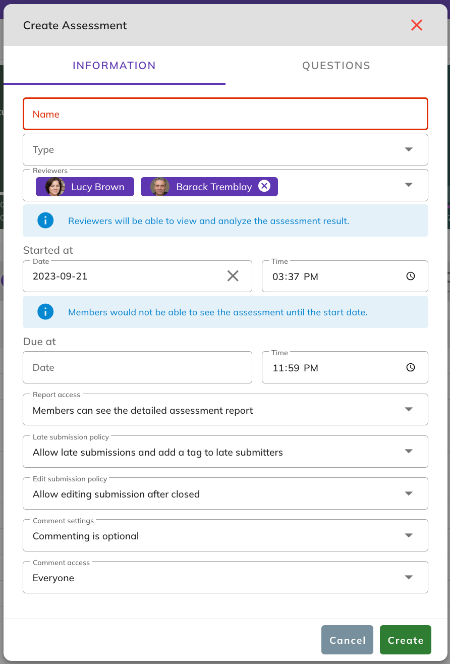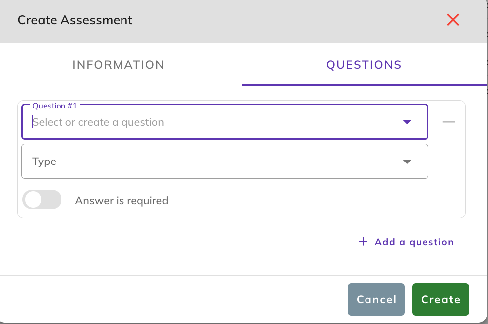 Click the + icon on top right of the assessment page to open Create Assessment modal.