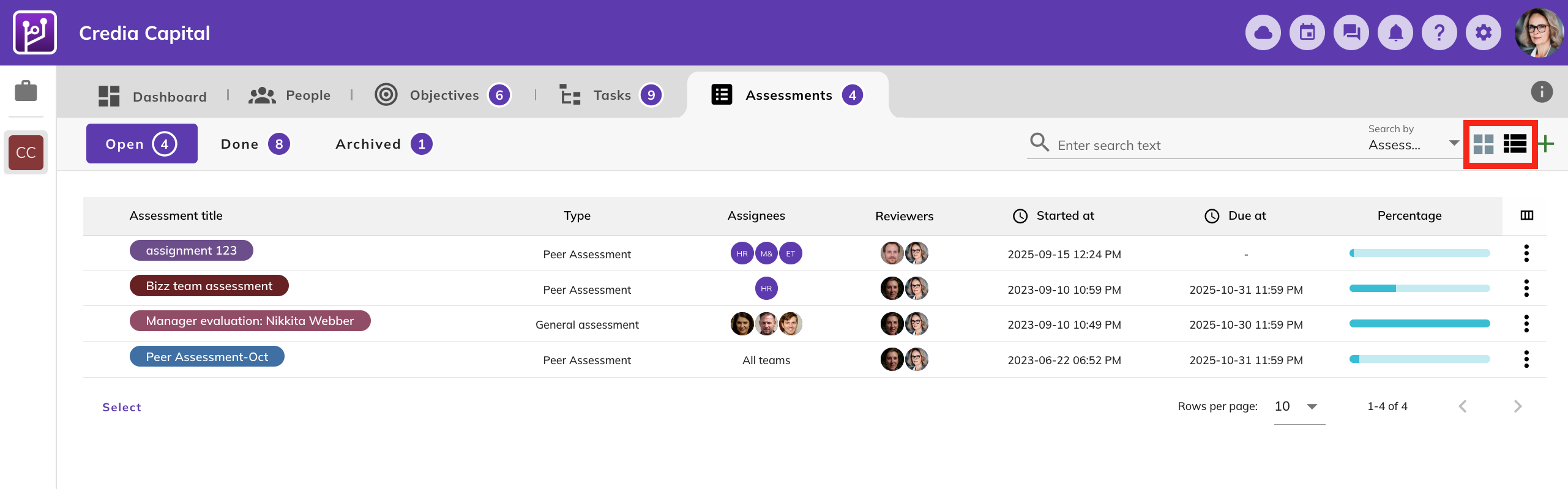 On the top right of the Assessment page you can choose between List view or Grid view.