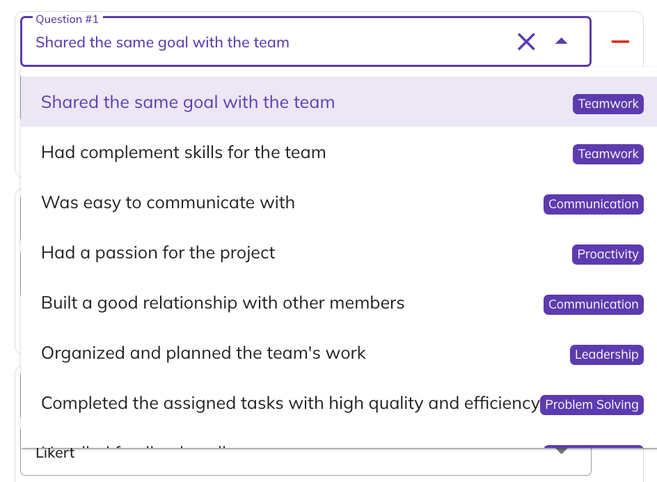 ![]() | If it's a General Assessment, simply add your questions and select a question type: Choice (turn on checkboxes to allow multiple answers), Likert (a 1–5 rating scale), or Text (open-ended responses). |