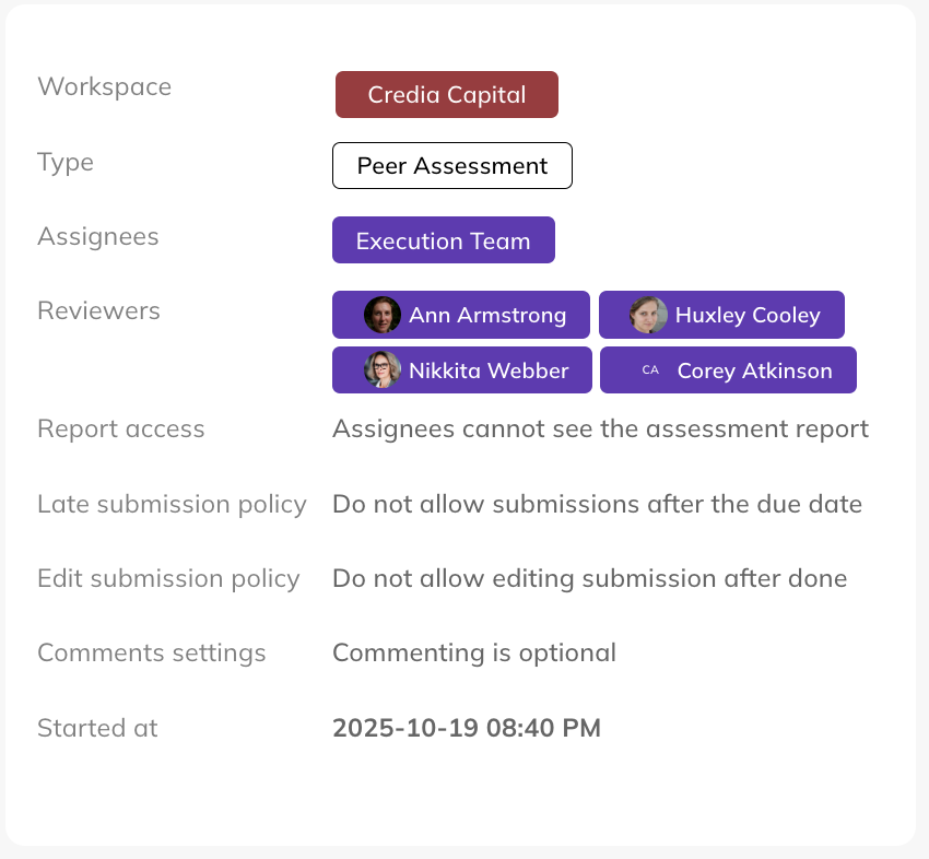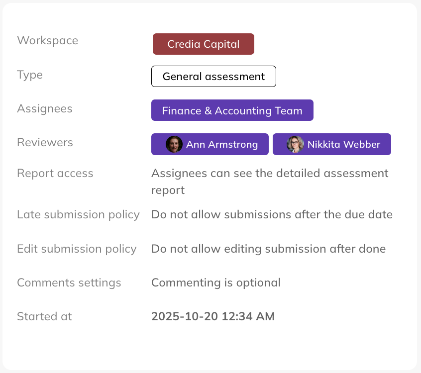 Assessment Info BoardSimilar to Peer Assessments, on the left side of a general assessment, you’ll find key details such as the assessment's workspace type, assignee(s), reviewer(s), start and due dates, and settings. | ![]() |