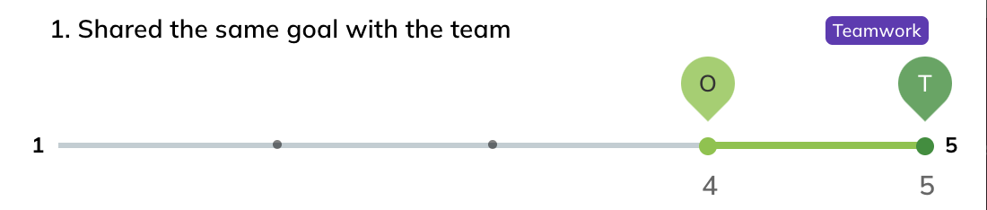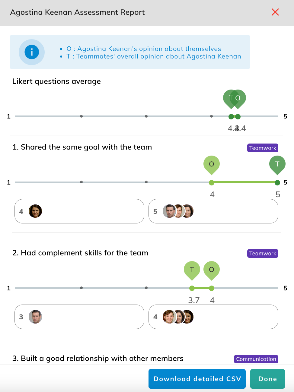 Peer Assessment ResultsWhen all team members have completed the assessment, click the ( At the top of the report, you can compare the average score given by all teammates across all questions (T) to the score the member gave themselves (O), on a Likert scale. Below that, you’ll find detailed results for each question, including: