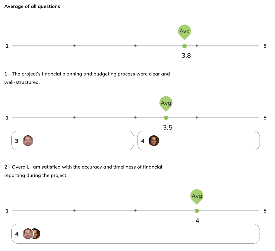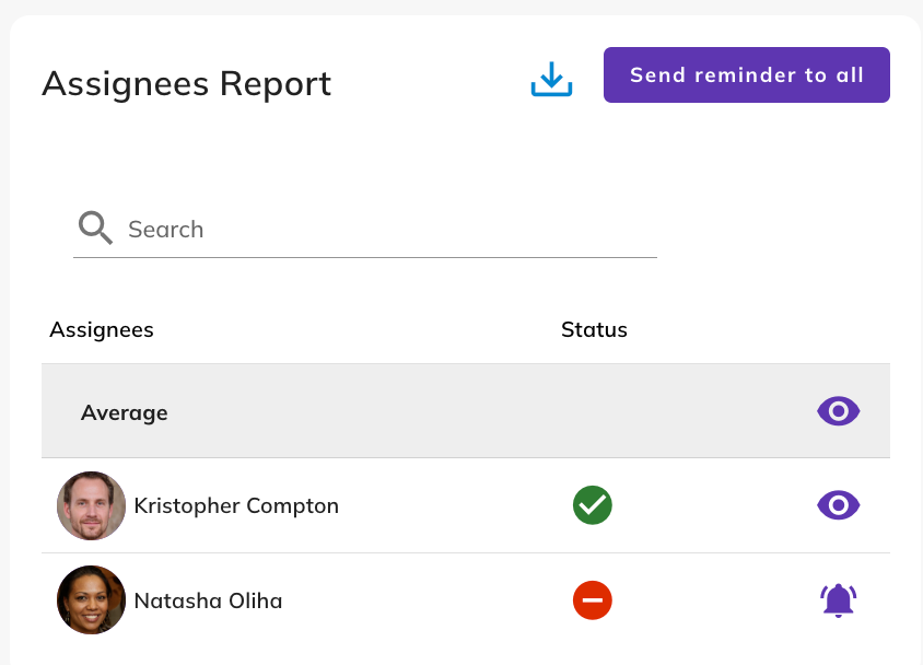 If, in the assessment settings, you set “Assignees can see the anonymized assessment report,” assignees will be able to view the average score they gave themselves and the average scores from all teammates for each question once the assessment is completed by everyone.