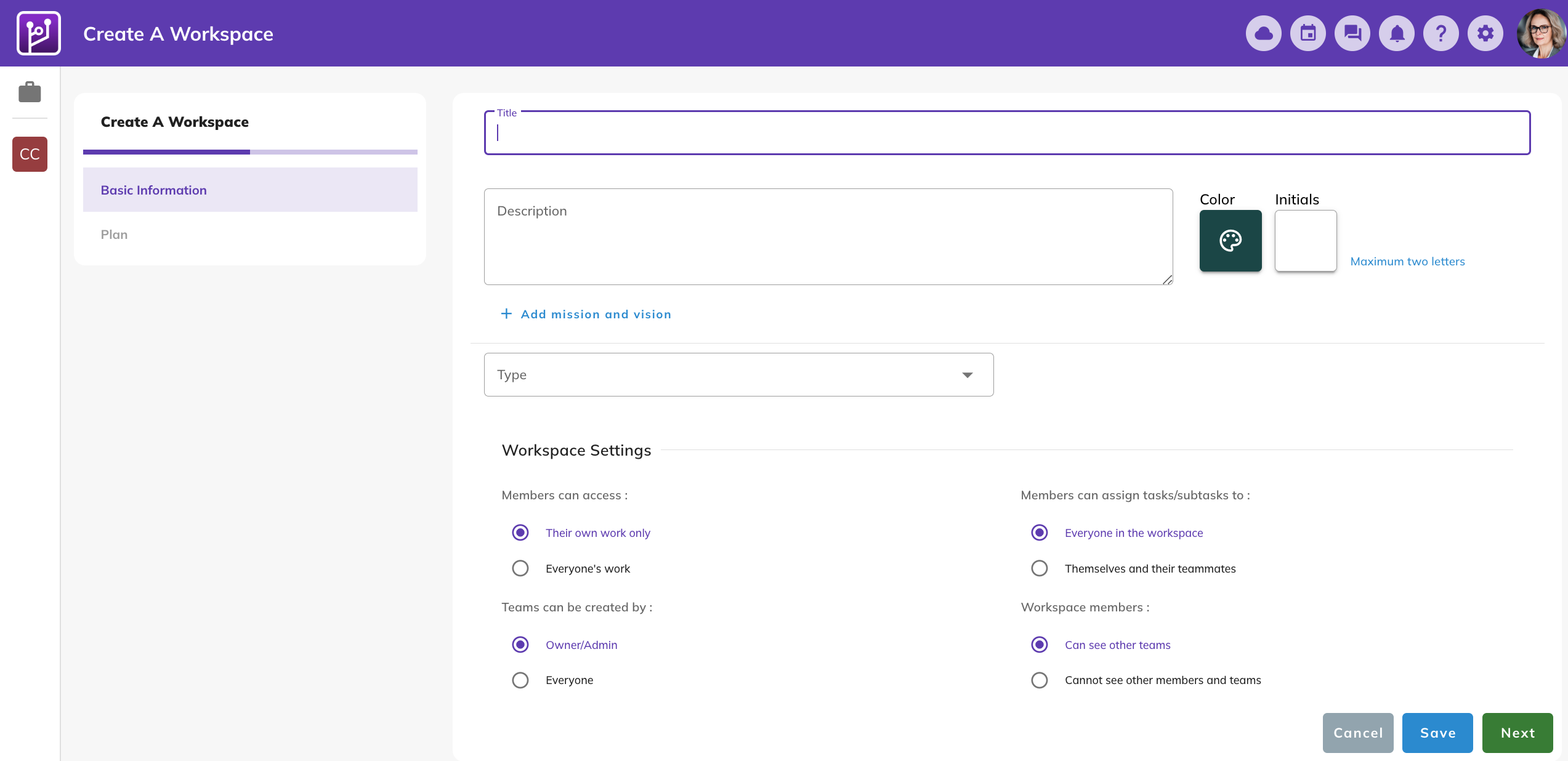 Initials: The workspace will appear in the Workspaces bar with these initials.