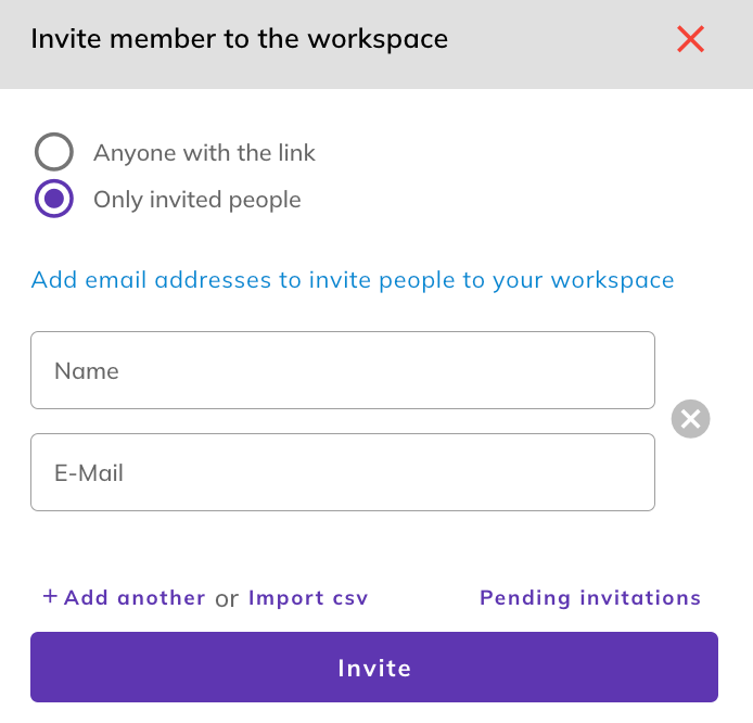Note: Confirm with the individuals you are inviting that they consent to using and have access to the email you provide, as it will be visible in their profile and they will receive workspace notifications at this address.