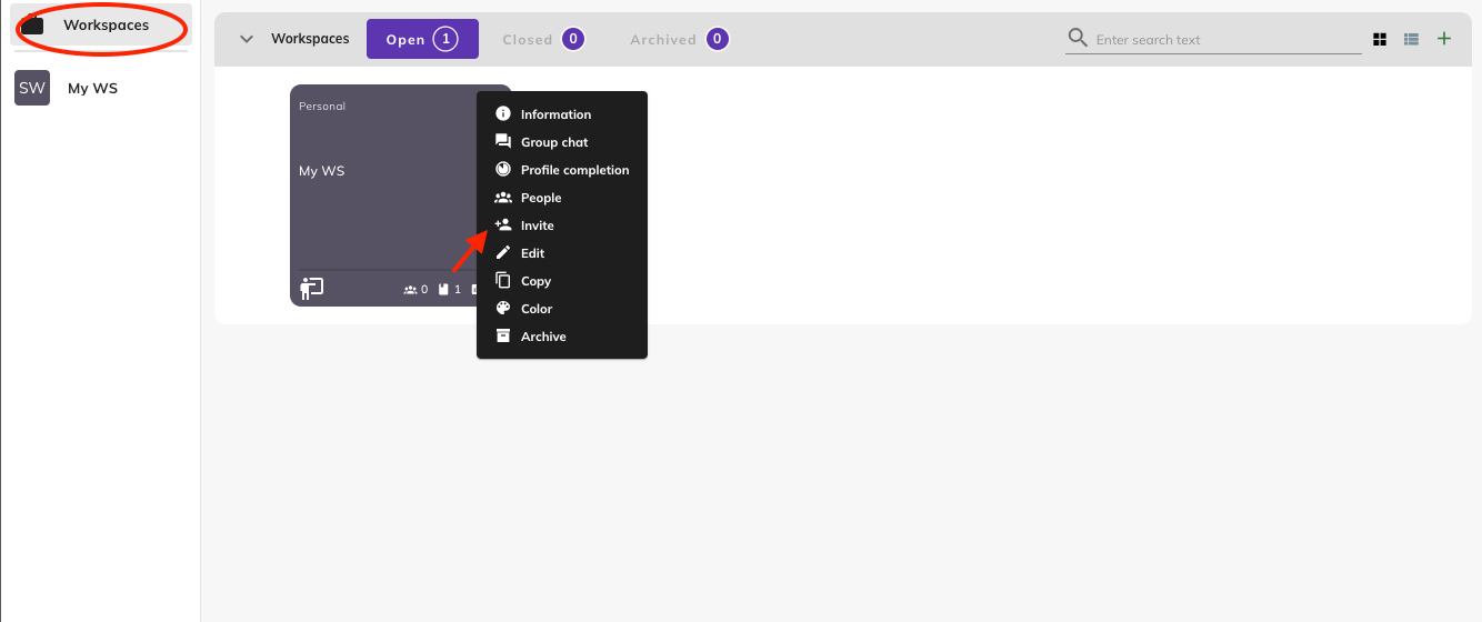 - Workspaces page: On the Workspaces page, click the "⋮" icon on the top right of your workspace tile, and select Invite from the drop-down menu.
